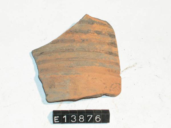 Frammento di parete di bicchiere a risega mediana con costolature esterne e decorazione a stampiglia di rosette.