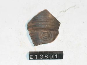 Frammento di parete di bicchiere a risega mediana con costolature esterne e stampiglia a cerchielli concentrici.