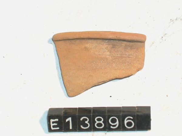 Frammento di orlo e parete di bicchiere con orlo esoverso. Costolature esterne appena sotto l'orlo.