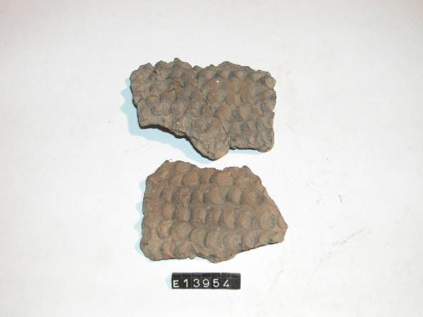Frammento di parete di olletta decorata ad alveare di piccole unghiate regolari.