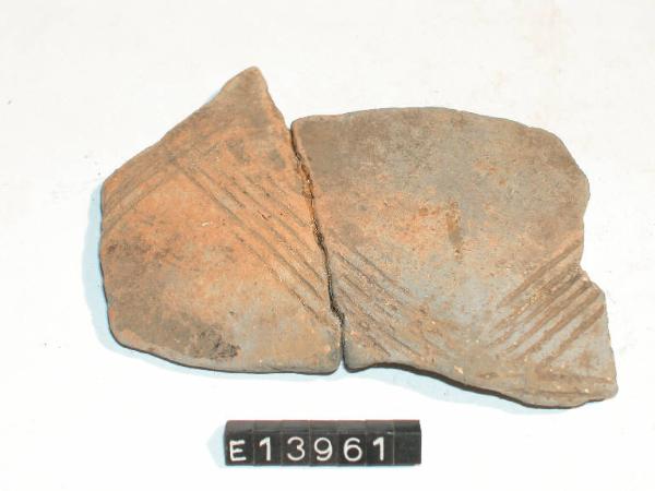 Frammento di parete di recipiente con decorazione esterna composta di solchi diagonali a zig zag.