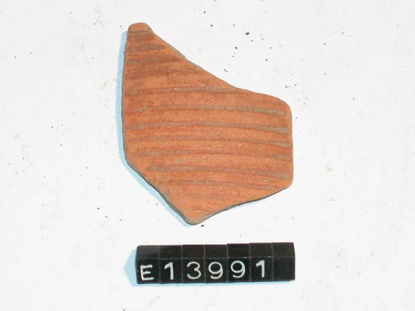 Frammento di parete costolata pertinente a un bicchiere a risega mediana (tipo D1?). Superficie rosata.