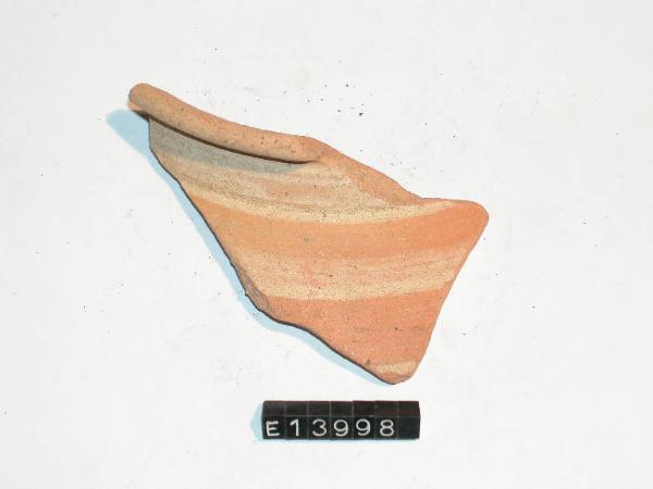 Frammento di orlo esoverso e collo troncoconico di olla decorata da fasce bianche dipinte.