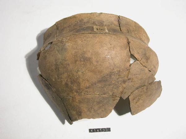 Urna troncoconica con orlo arrotondato estroflesso, gola profilata, decorata sulla spalla a falsa cordicella con due righe orizzontali e una zigzag.