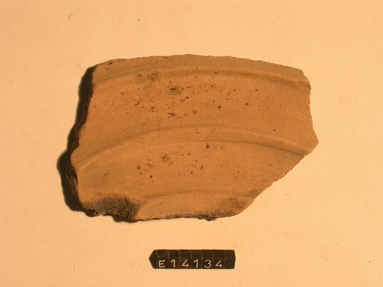 Frammento di elemento fittile con tre costolature concentriche.