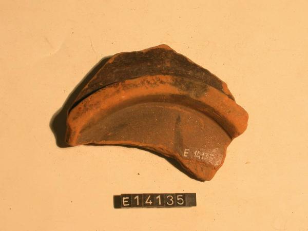 Frammento di fondo e parete di ciotola con piede ad anello; dipinta internamente ed esternamente di nero.