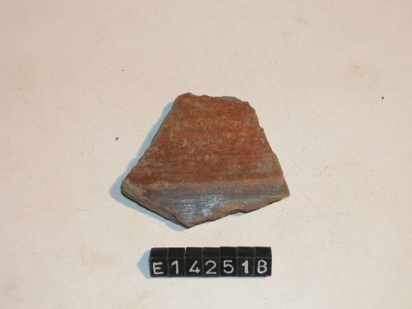 Frammento di parete di recipiente con leggera costolatura esterna che separa due fasce di colore rispettivamente rosso e nero.