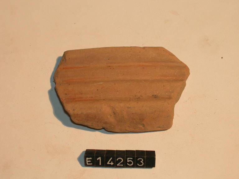 Frammento di orlo e parete di coppa con spalla carenata, labbro diritto con costolature e tracce di dipintura esterna rossa.