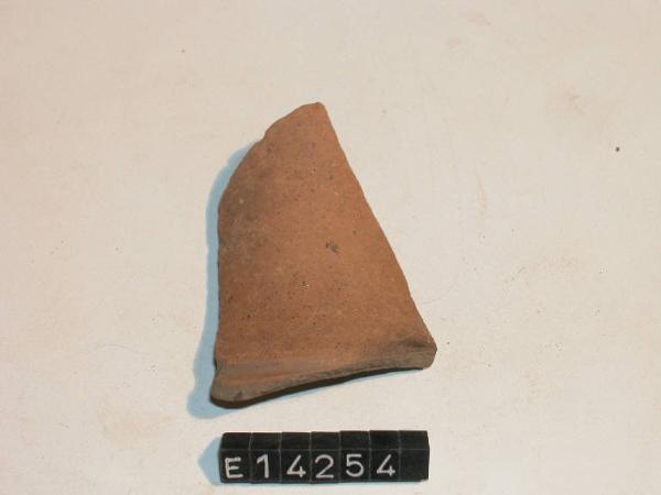 Frammento di parete di bicchiere a risega mediana, forse di tipo G. Superficie esterna rosata, superficie interna marrone.