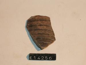 Frammento di piede di bicchiere a risega mediana tipo B o C1, con superficie esterna marrone lucida.