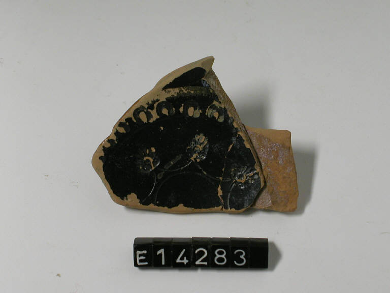 Frammento di parete a vernice nera decorata a palmette e a volute.