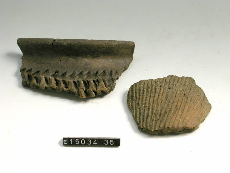 Olla ovoide con labbro estroflesso e decorazione impressa ad alveare con una fila di tacche oblique.
