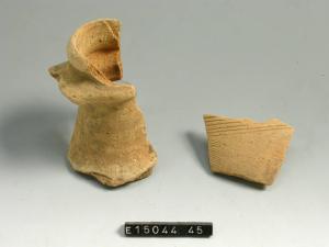 Frammento di orlo e collo di olpe con orlo obliquo, collo cilindrico con costolatura da cui parte l'ansa a nastro.