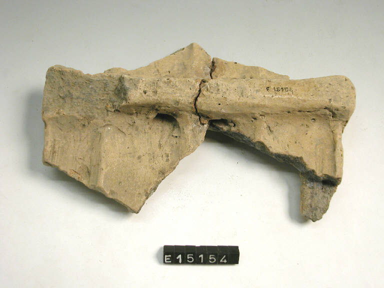 Frammento di vaso di forma quadrangolare con cordonature e due fori passanti.