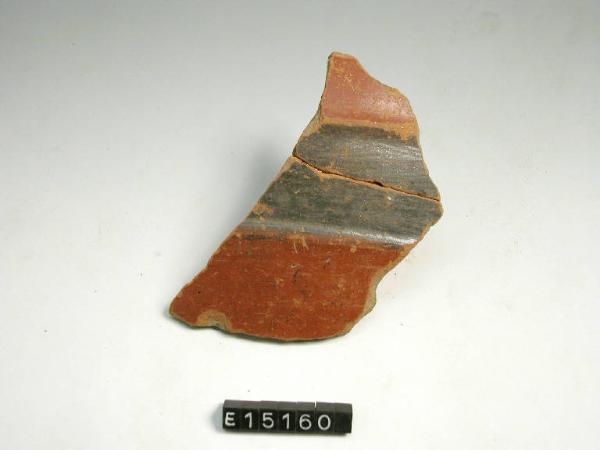 Frammento di recipiente cordonato decorato a fasce rosse e nere alternate