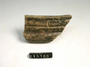 Frammento di coppa carenata con orlo cordonato; due costolature sul labbro; superficie esterna nero lucida.