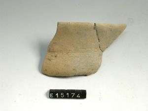 Frammento di orlo e parete di bicchiere carenato con lungo labbro svasato decorato da linee orizzontali nella gola