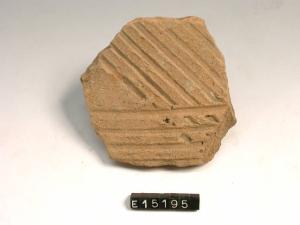 Frammento di parete decorata esternamente da solchi orizzontali e diagonali regolari.