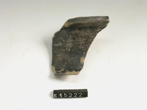 Frammento pertinente a bicchiere carenato con alto collo e labbro esoverso; superficie di colore nero lucido.