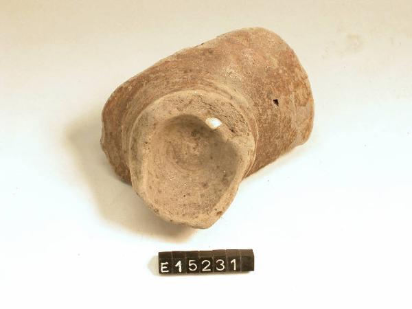 Frammento di fondo e parete pertinente a coppa. Il piede presenta una tipologia a tromba strozzato da un anello; superficie lucidata internamente ed esternamente.