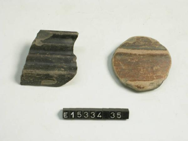 Frammento di parete decorato esternamente da due costolature che separano fasce di colore rosso e nero alternate.