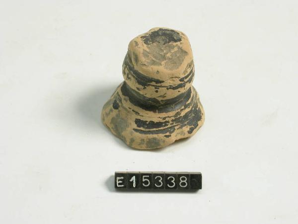Frammento di presa pertinente a coperchio con decorazione esterna a solcature concentriche.