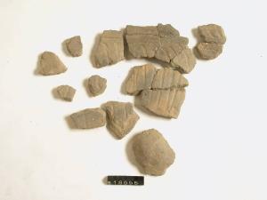 Frammenti di parete pertinenti a vaso biconico con larghe solcature oblique e motivo decorativo a falsa cordicella.