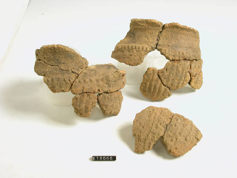 Vaso troncoconico con orlo esoverso, obliquo verso l'interno e scanalato; lungo la spalla cordone digitato; nella parte inferiore del corpo serie di scanalature verticali; presa orizzontale.