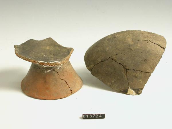 Fondo e frammento di parete pertinente a coppa su medio piede con labbro rientrante e orlo obliquo all'interno.