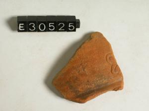 Frammento di bicchiere a risega mediana stampigliato con fiore a quattro petali e superficie rosso corallina