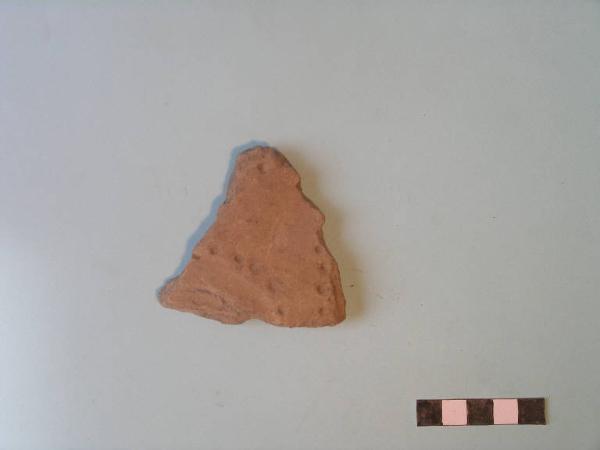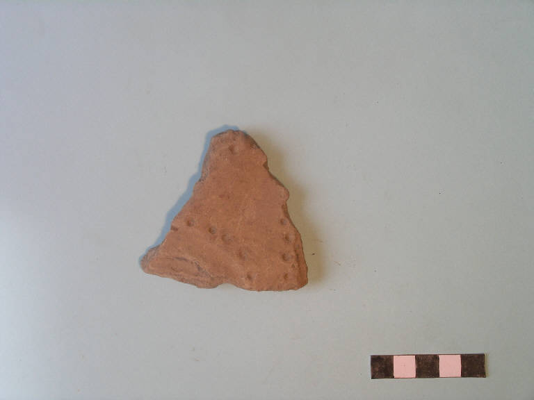 Frammento di parete probabilmente pertinente a vaso biconico, decorata da fasci di solcature semicircolari, marginate da punti impressi a cannuccia.