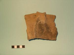 Frammento di scodellone troncoconico, orlo distinto esoverso su cui è impostata una stretta ansa canaliculata leggermente insellata, con appendici verticali coniche.