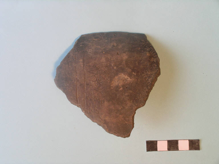 Frammento di vaso troncoconico con la parete decorata da un motivo ripetuto composto da sottili linee incise a zig-zag, marginate da piccole impressioni ovoidali, separate da due linee incise verticali.