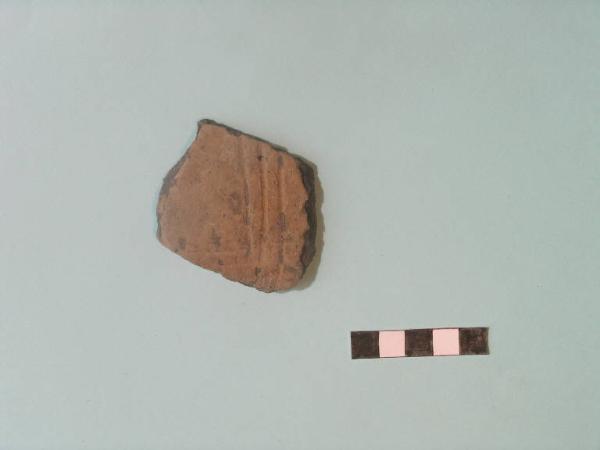 Frammento di parete dcorata da tre sottili solcature parallele, che formano un angolo retto.