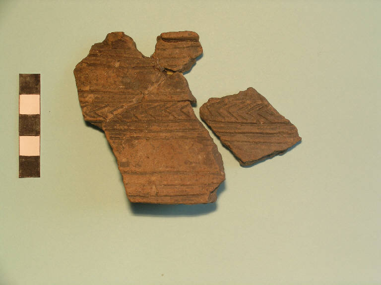 Porzione superiore di vaso dal profilo ovoide/biconico, con orlo piatto e breve labbro esoverso; sulla parete si alternano motivi di linee incise orizzontali, che racchiudono incisioni a spina di pesce.