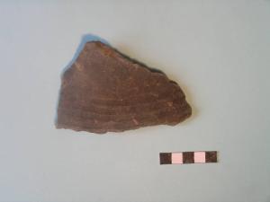 Frammento di parete di vaso biconico, decorata da un fascio di cinque solcature orizzontali.