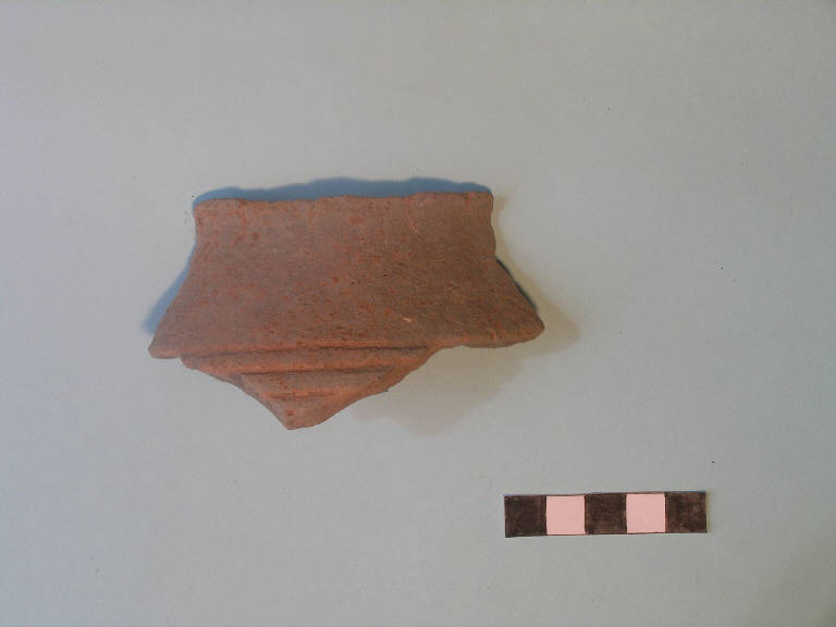 Frammento di vaso biconico/olletta, orlo assottigliato esoverso, parete decorata da un fascio di tre solcature orizzontali.