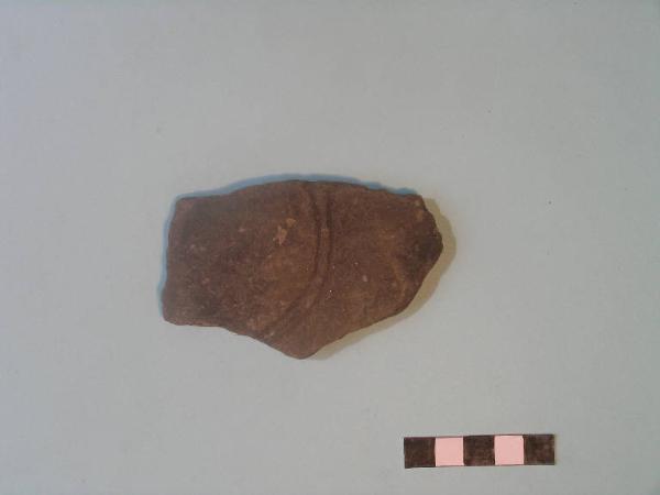 Frammento di parete a profilo leggermente convesso, con motivo decorativo di due linee incise semicircolari concentriche.