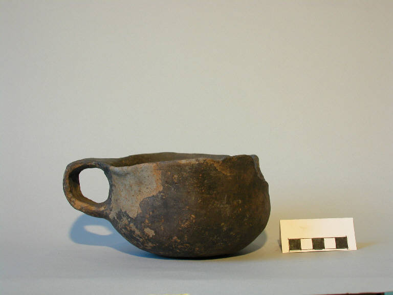 Tazza a profilo globulare, orlo arrotondato esoverso, fondo piatto; tra l'orlo e metà della vasca è impostata un'ansa a gomito con braccio superiore orizzontale.
