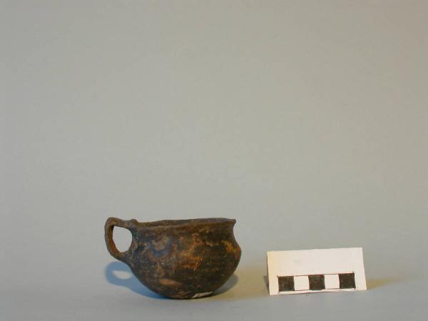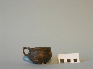 Tazzina carenata, orlo assottigliato, labbro esoverso, parete verticale concava, carena arrotondata, vasca convessa, fondo ombelicato; tra orlo e carena è impostata un'ansa a gomito con braccio superiore leggermente obliquo.
