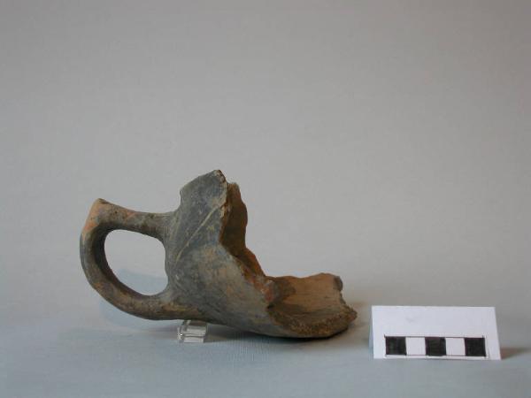 Tazza carenata frammentaria: orlo piatto, breve labbro verticale, parete rettilinea rastremata, carena arrotondata, vasca a calotta; una grossa ansa a gomito con braccio superiore obliquo verso l'alto e breve appendice asciforme è impostata sopra e sotto la carena.