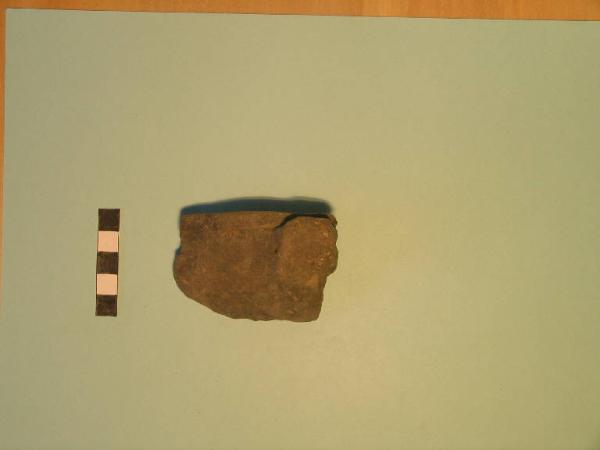 Frammento di tazza troncoconica, orlo arrotondato, parete a profilo convesso; sotto l'orlo è applicata una piccola ansa ad ascia forata orizzontalmente.