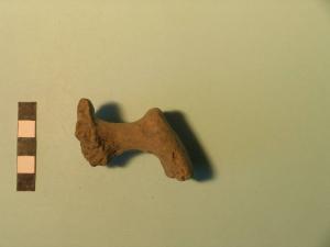 Frammento di orlo arrotondato, su cui è impostato l'attacco di un'ansa a gomito con breve appendice asciforme.