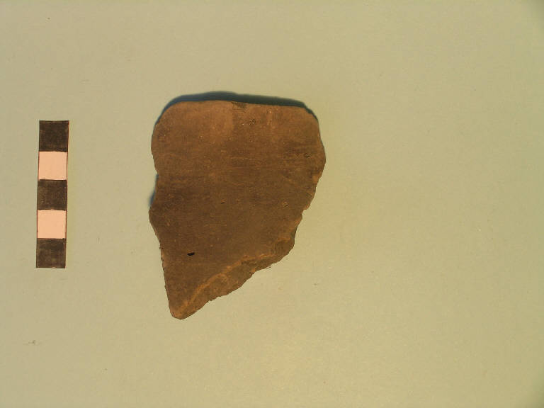 Frammento di orlo pertinente a recipiente dall'imboccatura chiusa (olla/biconico): orlo arrotondato, labbro esoverso.