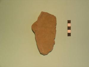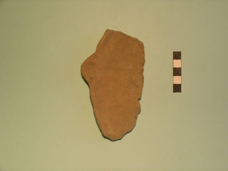 Frammento di teglia, orlo arrotondato, labbro esoverso; il fondo interno presenta una solcatura radiale, probabilmente relativa a un motivo cruciforme, che termina con una presa a linguetta triangolare sull'orlo.