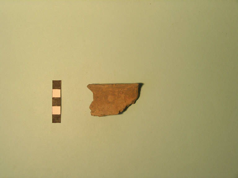 Frammento di orlo, probabilmente pertinente a vaso dalla stretta imboccatura (ovoide/biconico): orlo assottigliato, labbro esoverso.