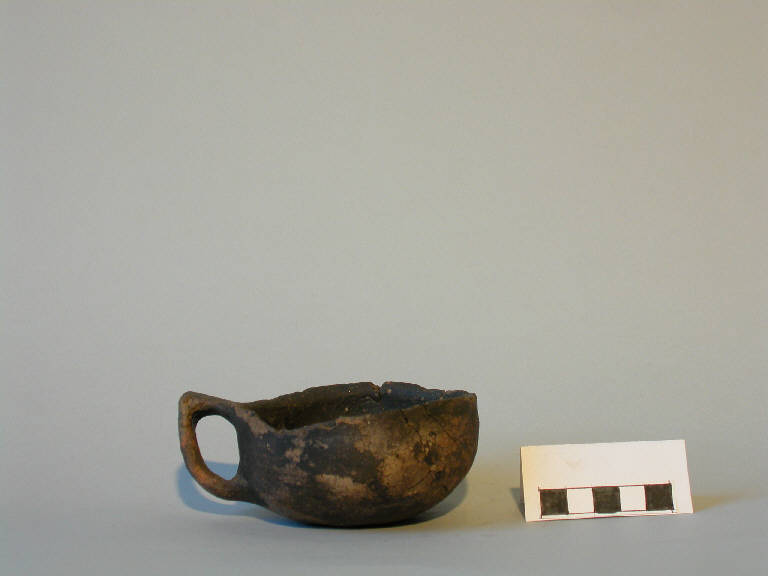 Tazza emisferica, orlo obliquo, piccolo fondo ombelicato; tra orlo e fondo è impostata un'ansa a gomito con braccio superiore leggermente obliquo.
