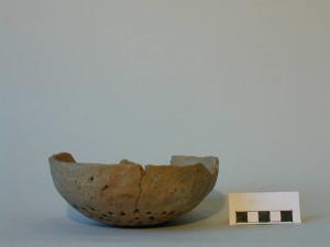 Colatoio con profilo a calotta, orlo arrotondato, fondo convesso; il fondo e la parte inferiore della parete presentano fori passanti circolari regolarmente distanziati, del diametro di circa 4 mm.