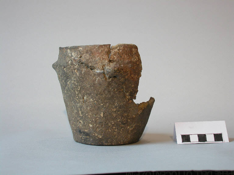 Vaso troncoconico frammentario, orlo piatto, parete rettilinea, fondo piatto; a breve distnza dall'orlo sono applicate due bugnette coniche.