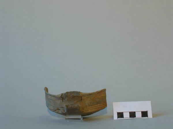 Frammento di tazza carenata, orlo esoverso, parete rettilinea verticale, vasca a calotta; tra orlo e carena si conservano gli attacchi di un'ansa sopraelevata. La parete è decorata da due fasci paralleli di tre linee incise orizzontali che, in corrispondenza dell'ansa, terminano con punti impressi.